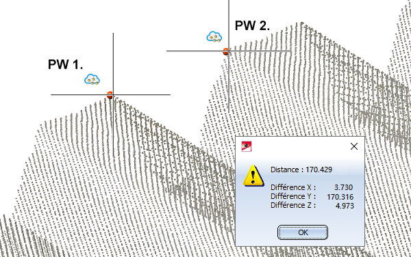L’emplacement des deux points et la direction d'insertion sont affichés dans la scène. Les points du nuage de points sont représentés par un point rouge.