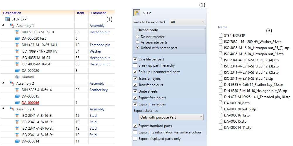 (1) HiCAD part structure, (2) Export settings, (3) created STP files