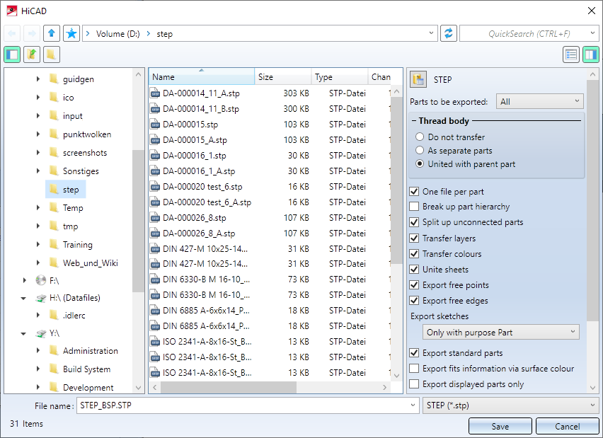 Make the desired settings and specify the path and name of the export file. When you exit the window with OK, the STEP file is generated with the settings you have made.