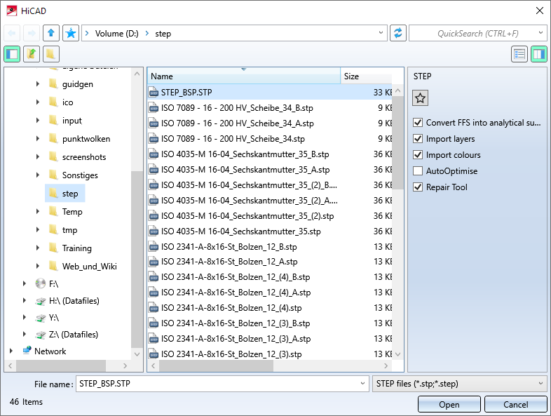 After calling the function, first select the file type STEP file (*.stp, *.step) and then the STEP file you want to open.