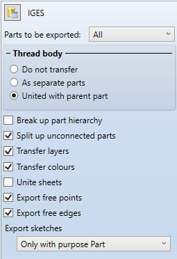 Make the desired settings and specify the path and name of the export file. When you exit the window with OK, the IGES file is generated with the settings you have made.