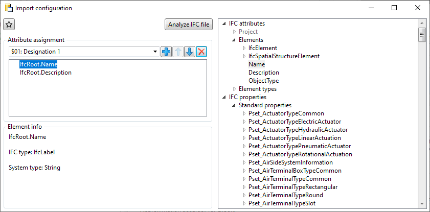 Use the Analyze IFC file button to select an existing IFC file which will then be analyzed. Your individual PropertySet definitions will be additionally loaded into the tree of IFC attributes that can be mapped with appropriate HiCAD attributes on the left hand side.