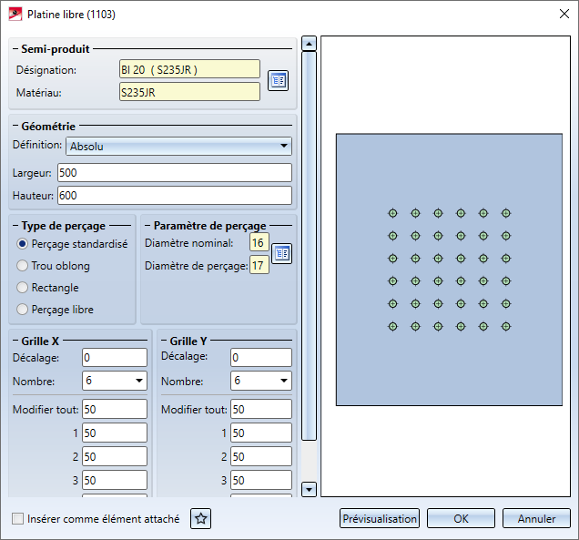À l'aide de cette fonction, vous insérez des platines pré-percées de tôle ou d'acier plat. En plus des perçages normés, les trous oblongs ainsi que les perçages libres sont possibles.