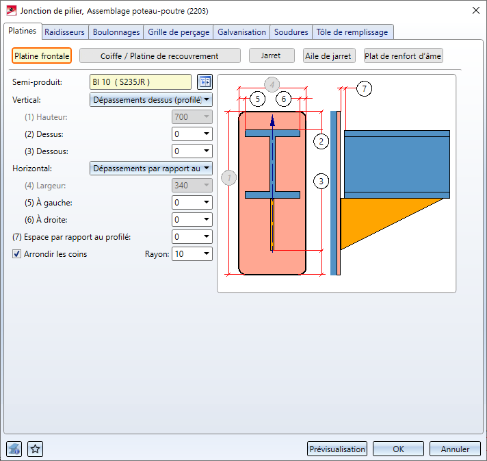 À l'aide de cette fonction, deux profilés en I seront raccordés ensemble à l'aide d'un assemblage vissé ou soudé, qui peut être inséré avec ou sans raidisseur ou jarret, ainsi d'autres composants comme des ailes de jarret, des plats de renfort d'âme, des tôles de renfort et des tôles de remplissage. Également l'insertion de raidisseurs supplémentaires sur le pilier et sur la poutre, l'insertion de soudures ainsi que les perçages pour la galvanisation sont possibles.