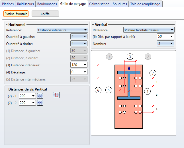 La grille de perçage permet de déterminer la disposition du boulonnage ou gabarit de trou sur la platine frontale. Les paramètres peuvent être effectués séparément pour la platine frontale et la coiffe.