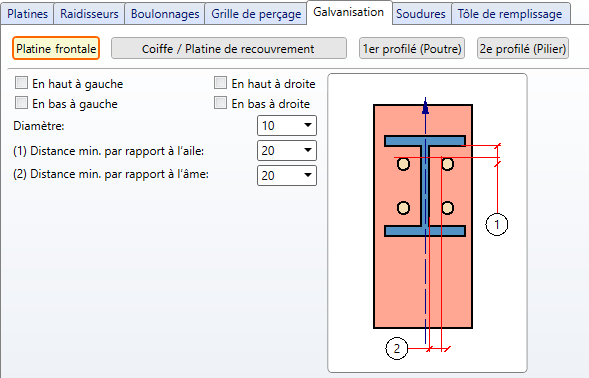Spécifiez ici si la platine frontale, la coiffe/platine de recouvrement et le profilé doivent être munis de trous pour la galvanisation. Cliquez pour cela sur chacun des boutons.