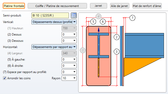 Dans cet encart de la fenêtre, vous déterminez le type, l'apparence et la taille de la platine sur la poutre (1er profilé) ainsi que l'orientation de la platine par rapport au profilé.