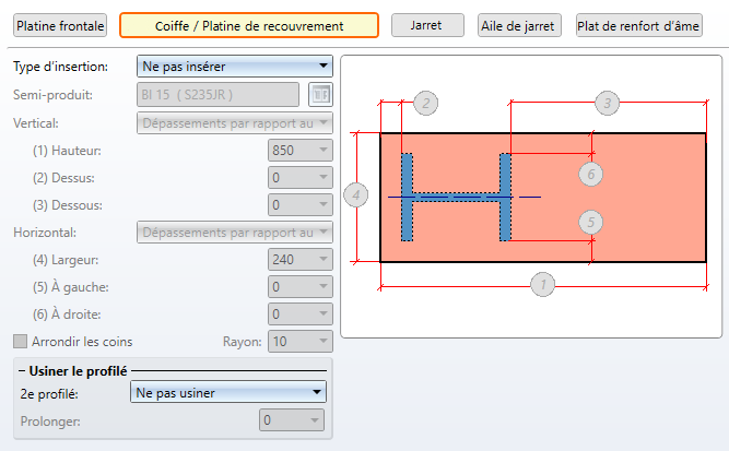 La détermination de la coiffe/platine de recouvrement (sur le pilier) s'effectue de la même façon que la détermination de la platine frontale sur la poutre. Vous pouvez spécifier en supplément ici, sous Type d'insertion si la platine doit être insérée (comme platine de recouvrement), apposée (comme coiffe) ou ne pas être insérée du tout.