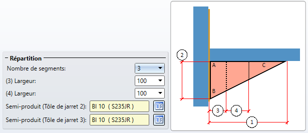 Vous déterminez ici les paramètres pour le plat de renfort de l'âme. Vous pouvez y sélectionner sous Type d'insertion si le plat de renfort doit être inséré à droite, à gauche, bilatéralement ou ne pas être inséré du tout.