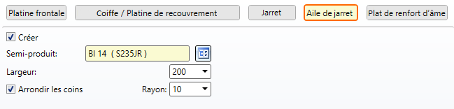 Après un clic sur le bouton Aile de jarret, vous pouvez sélectionner le semi-produit de votre choix pour l'aile de jarret et spécifier sa largeur ainsi que l'usinage des coins. Si aucune aile de jarret ne doit être créée, décochez alors la case Créer.