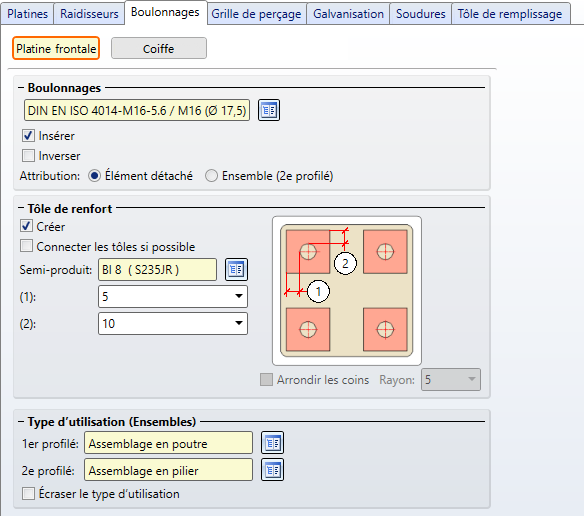 Indiquez sous (1) et (2) la distance des boulonnages par rapport aux bords de la tôle de renfort, puis sélectionnez par un clic sur le symbole