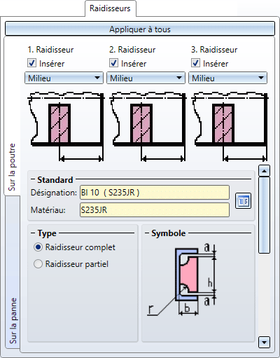 Vous pouvez insérer jusqu'à 3 raidisseurs au niveau de la panne aussi bien que de la poutre. Cochez pour cela les cases Insérer. Pour chaque raidisseur, vous pouvez par ailleurs spécifier quelle arête est concernée par l'insertion, celle de devant, du milieu ou de derrière. La distance indiquée dans l'onglet Géométrie sera alors utilisée pour le paramètre sélectionné ici. Un petit exemple : vous décidez d'insérer trois raidisseurs et vous sélectionnez Milieu, Devant, Derrière. Dans l'onglet Géométrie, vous avez sélectionné une distance de 75. Les raidisseurs seront alors insérés de telle manière que la distance entre le derrière du deuxième raidisseur et le milieu du premier raidisseur, et la distance entre le devant du troisième raidisseur et le derrière du deuxième raidisseur auront la valeur spécifiée.