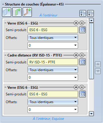 Dans cet encart de fenêtre, vous spécifiez de quelles couches sera constituée la surface vitrée. Lorsque vous avez choisi comme méthode de création Semi-produit, vous ne pouvez procéder dans cet encart à aucun paramétrage. Sinon, vous pouvez ici configurer les différentes couches.