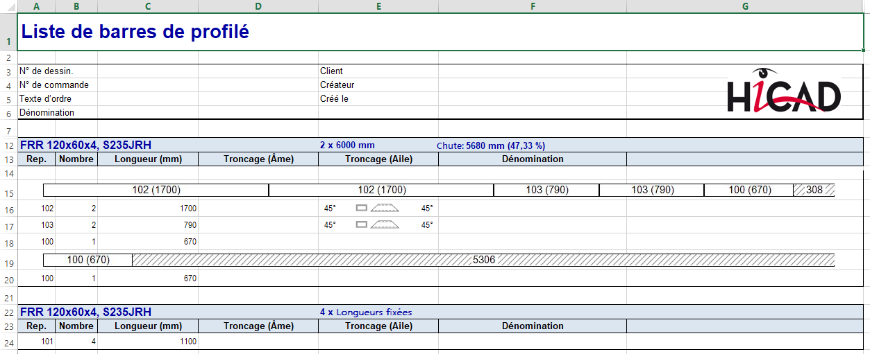 Dans HiCAD, cela peut désormais être effectué via l'Attribut Longueur fixée (%FIXLEN) qui attribuera en conséquence les profilés concernés. Si cet attribut possède la valeur 0 ou s'il n'est pas défini, la longueur fixée ne sera alors pas prise en compte dans la liste des barres de profilé. Si sa valeur est 1, ces profilés seront alors répertoriés séparément dans la liste des barres de profilé.