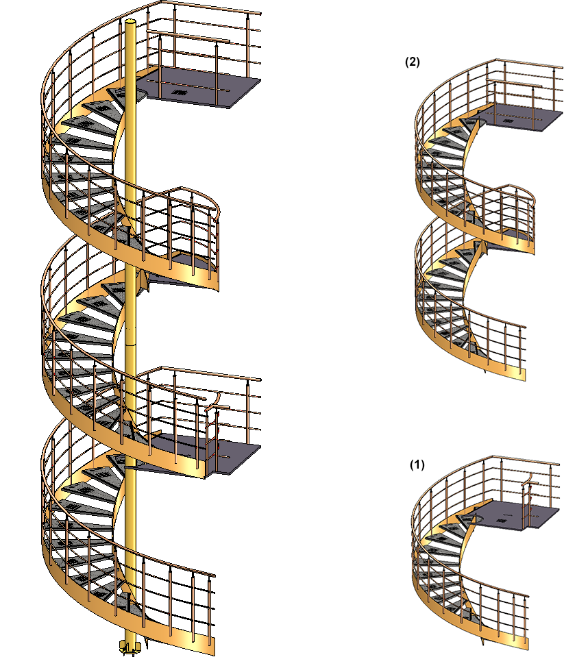 L'illustration suivante montre un escalier en colimaçon avec deux étages (1) et (2) construit à l'aide des paramètres par défaut définis par ISD.