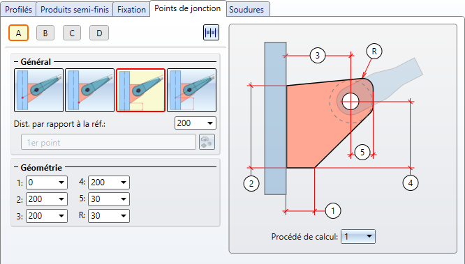 Vous déterminez ici comment les goussets seront raccordés sur les profilés et les ancres à bâton. En outre, dans cette fenêtre sera spécifiée la géométrie des goussets.