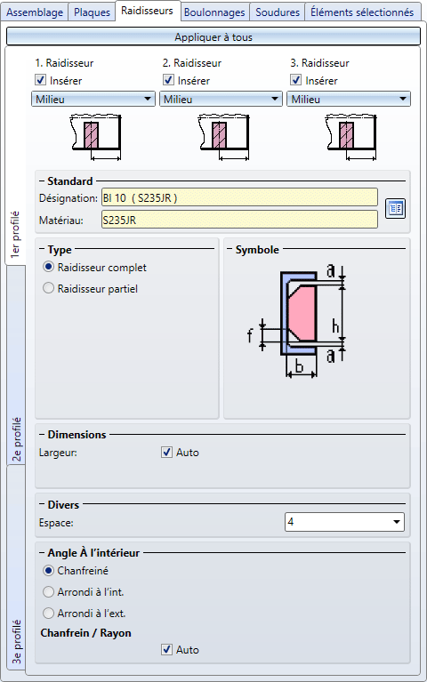 L'assemblage peut être créé avec ou sans raidisseurs. Cela peut être paramétré individuellement pour chacun des trois profilés. Un maximum de trois raidisseurs par profilé est possible.