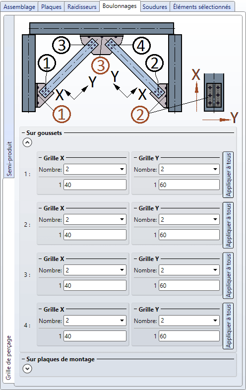 Dans cet onglet, vous déterminez la grille de perçage pour les boulonnages sur les goussets et le type de vis.