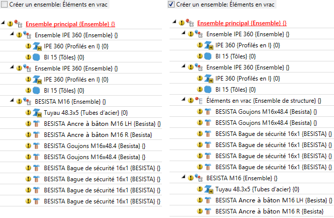 Si cette case est cochée, les goujons et les bagues de sécurités pour la fixation sur les goussets seront alors regroupés dans un ensemble de structure au nom de Éléments en vrac. Si cette case est décochée, les goujons et les bagues de sécurité seront alors subordonnés à l'ensemble du système de bâton-pilote.