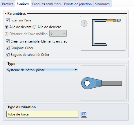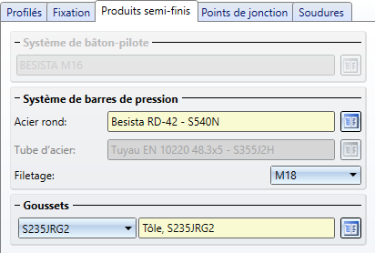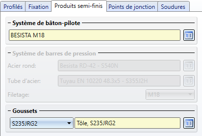 Dans cet onglet, vous sélectionnez les produits semi-finis pour le tube de force et les goussets. Les champs qui seront actifs dépendent du type d'exécution sélectionné dans l'onglet Fixation.