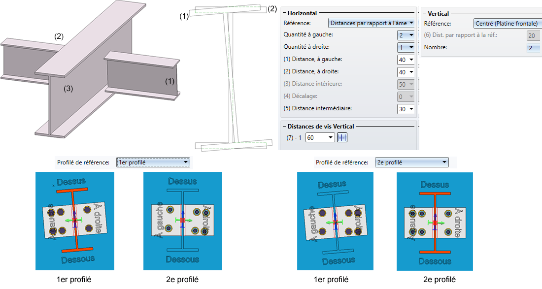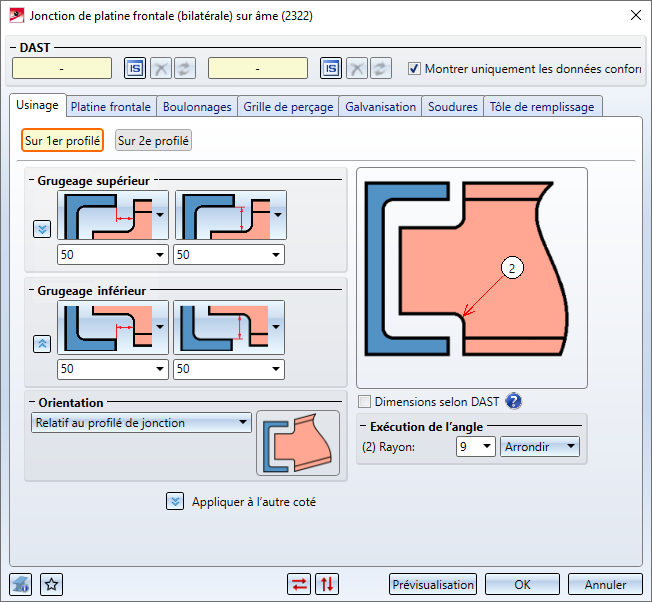 Dans cet onglet, vous paramétrez séparément les soudures pour le premier et pour le deuxième profilé à raccorder.