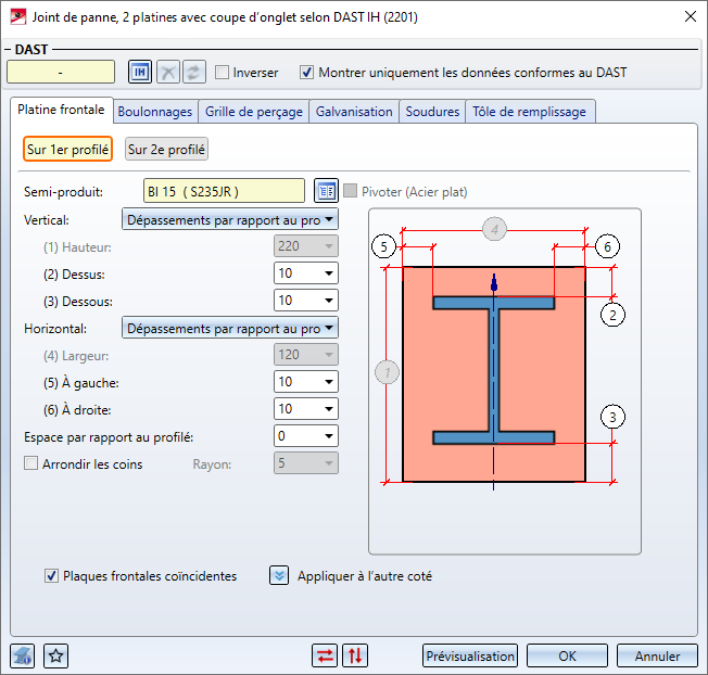 3. La fenêtre de dialogue Joint de panne, 2 platines avec coupe d'onglet selon DAST IH (2201) s'ouvre.