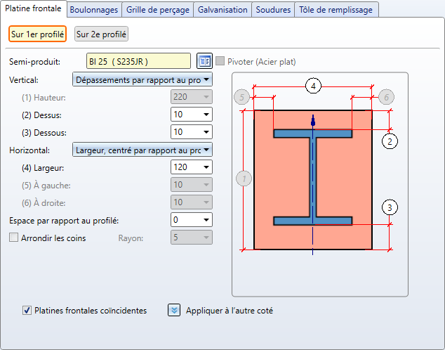 Cette fonction raccorde deux profilés au moyen de deux platines frontales rigides vissées ensemble. Celles-ci peuvent être à fleur l'une par rapport à l'autre aussi bien que dépassées dessus, dessous ou latéralement. Le boulonnage peut être aligné asymétriquement ou symétriquement. Au besoin, les profilés seront automatiquement raccourcis, allongés et/ou coupés en onglet. Par ailleurs, il est également possible d'insérer si désiré directement les soudures ainsi que les tôles de remplissage.