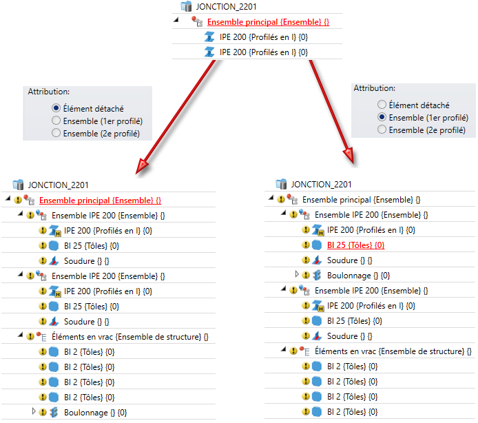 Sous Attribution, vous déterminez à quel ensemble les boulonnages doivent être subordonnés. Si la case Élément détaché est cochée, les boulonnages seront alors regroupés dans un ensemble au nom de Boulonnage et attribué à l'ensemble Éléments en vrac, sinon il sera subordonné à l'ensemble du premier ou du deuxième profilé.
