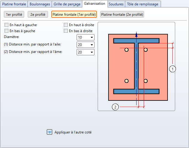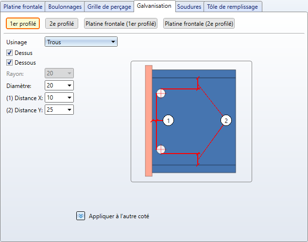Spécifiez ici si la platine frontale et si chacun des profilés de référence doivent être munis de trous pour la galvanisation. Activez pour cela l'encart correspondant en haut à gauche.