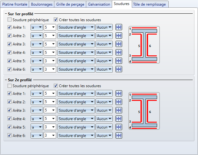 Dans cet onglet, vous spécifiez en cochant les cases correspondantes, séparément pour le 1er et le 2e profilé, quelles soudures doivent être créées :