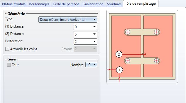 Si des tôles de remplissage doivent être insérées entre les deux platines frontales, vous pouvez alors spécifier dans l'onglet Tôle de remplissage le nombre, le type et la taille de ces tôles.