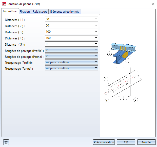 Vous spécifiez dans cet onglet les dimensions de la jonction de panne. Il s'agit des boulonnages et de la distance des raidisseurs.