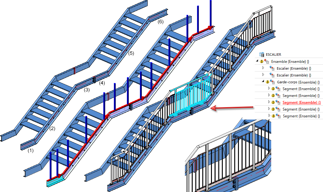 Pour le garde-corps, un ensemble au nom de Garde-corps est créé. Celui-ci est divisé en ensembles au nom de Segment comprenant les éléments du garde-corps correspondant à chacune des poutres. Un ensemble Segment est lui-même subdivisé en ensembles :
