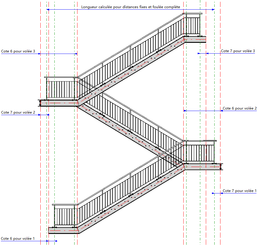 Notre exemple se comporte de 3 sections d'escalier (volée 1 à 3). Pour chaque volée, le garde-corps sera généré séparément pour le limon gauche puis droit de l'escalier. La création du garde-corps comporte donc dans notre exemple 6 étapes.