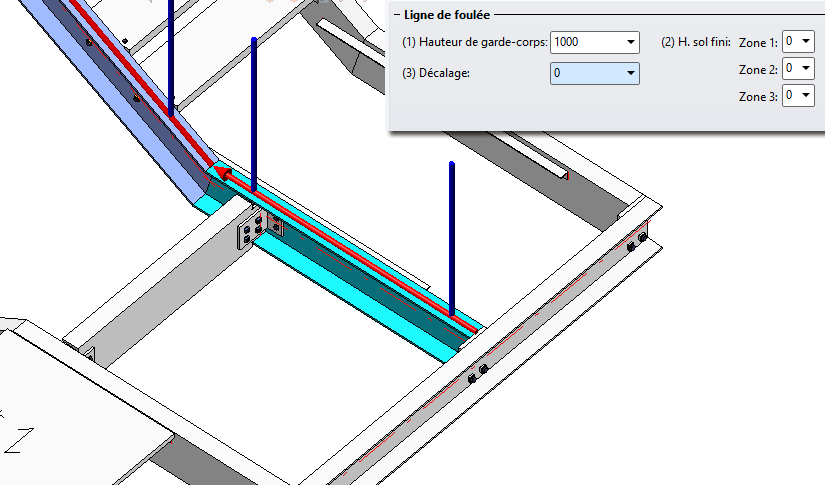 - Lancement du configurateur de garde-corps, sélection des profilés (1) à (3), de sorte que la ligne de foulée correspondent à celle illustrée. Terminez la sélection par un clic sur la molette de la souris.
