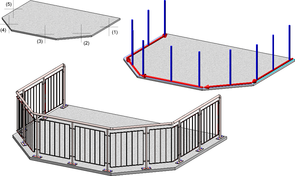 En haut : Solide 3D avec les arêtes sélectionnées (1) à (5). En bas : Exemple d'un garde-corps