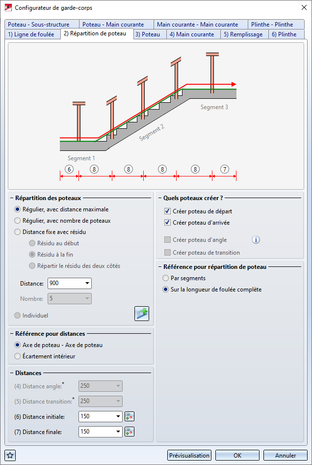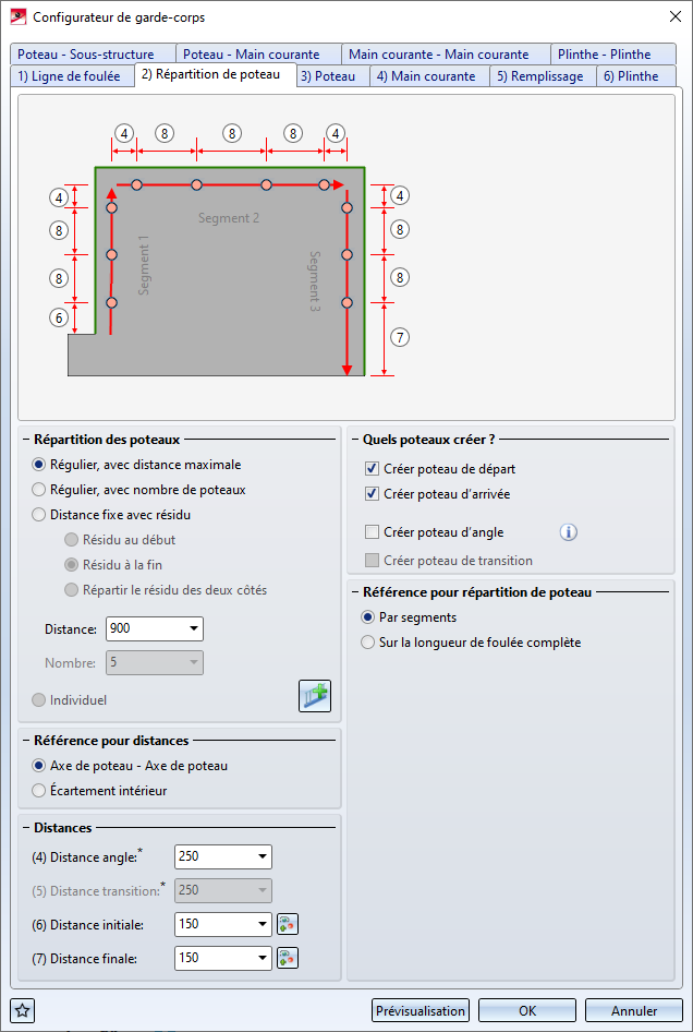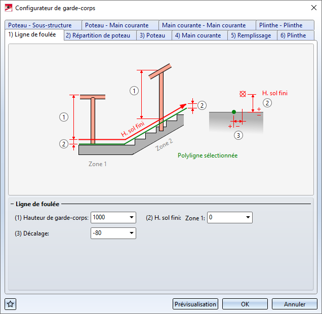 Vous mettez fin à la sélection des arêtes par un clic sur le bouton du milieu de la souris, ce qui active automatiquement la fenêtre de dialogue Configurateur de garde-corps. Le fonctionnement de la fenêtre suit le même principe que celui de la fonction Configurateur de garde-corps (le long des profilés), seuls les onglets Ligne de foulée et Répartition de poteau diffèrent quant aux images explicatives.