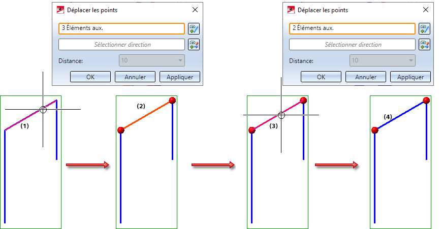 Dans la situation A, l'esquisse d'origine (1) a été modifiée avec la fonction Déplacer points, dans la situation B avec la fonction Déplacer les lignes-éléments, Conserver les lignes contiguës et adapter la longueur. Dans les deux cas, les éléments auxiliaires ont été sélectionnés via un rectangle (2) et la même direction (3) et la même distance ont été choisies. (4) montre les résultats.