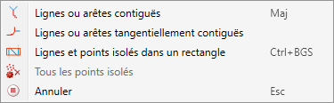 Lignes ou arêtes contiguës Cette fonction permet de supprimer en une seule fois, aussi longtemps que la sélection n'est pas ambiguë, toutes les lignes/arêtes contiguës à la ligne/arête identifiée. Vous pouvez de cette façon supprimer des polylignes/chaînes d'arêtes complètes.