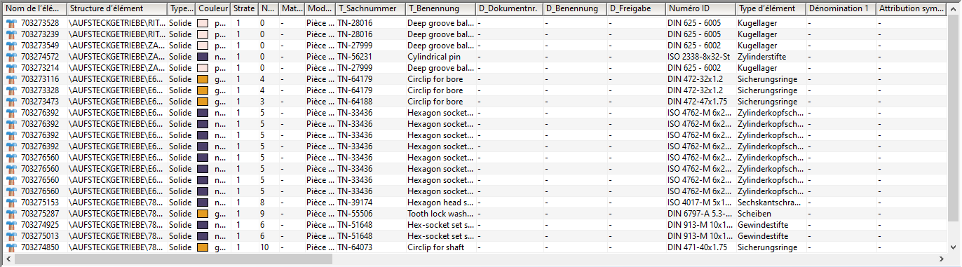 Contenu de la colonne Commentaire, type d'élément remplacé par les propriétés HiCAD |