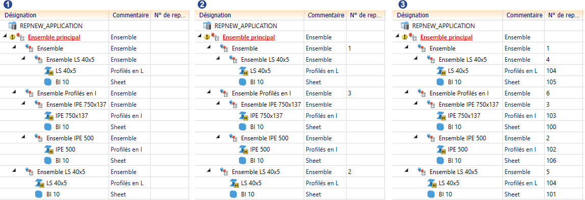 Maintenant, on effectue un repérage avec l'option Uniquement éléments nouveaux et modifiés. L'illustration à gauche montre le résultat sans cocher la case Ré-allouer les numéros déjà alloués. Le numéro de repère 3 (de l'ensemble supprimé) a été ici réattribué. À droite, vous voyez le résultat avec la case cochée.