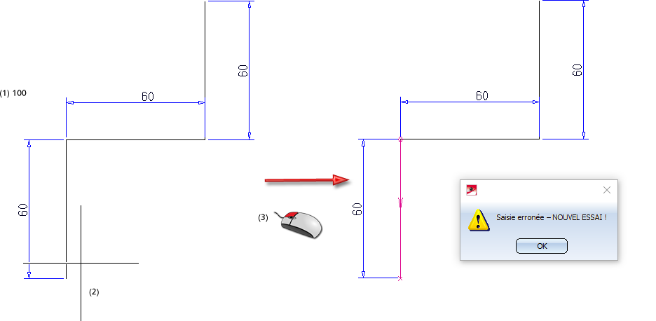 (1) Distance sélectionnée 100, (2) Ligne-élément sélectionnée - curseur à gauche, (3) Point pour l'extrémité du contour = clic droit, (4) Point de distance