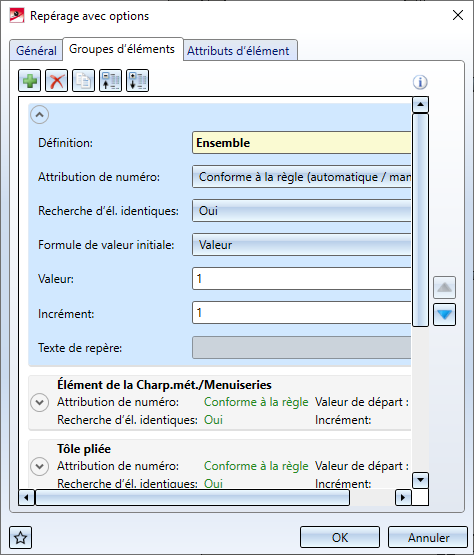 L'ordre des groupes d'éléments tel qu'ils sont listés dans la fenêtre de dialogue influence l'attribution de numéro de repère.