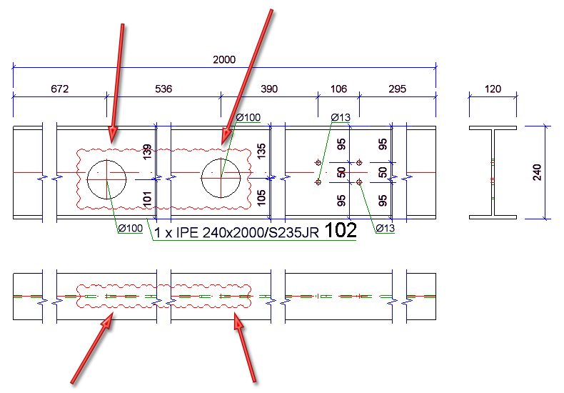 The drawings from our example have been released. Let us assume that you now want to insert two bores into the middle beam that is currently locked against further processing.