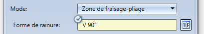 Pour les zones de fraisage-pliage, vous pouvez choisir l'outil de fraisage adapté au moyen de l'option Outils issue du catalogue Normes d'usine > Forme de rainure des panneaux composites.
