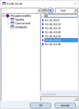 - Sélectionnez dans la fenêtre de sélection qui apparaît le perçage modèle Anneau01. Les variantes s'affichent à droite. Après avoir sélectionné une variante, par ex. R1-40, R2-30, confirmez votre choix par OK.