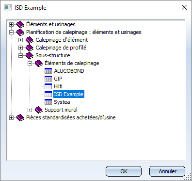 - Comme répertoire de données, sélectionnez Werksnormen\Unterkonstruktion\Example, comme catalogue Planification de calepinage : éléments et usinages \Sous-structure\Éléments de calepinage\ISD Example. Vous pouvez reprendre les données qui apparaissent telles quelles ; un bitmap ne doit pas être créé.