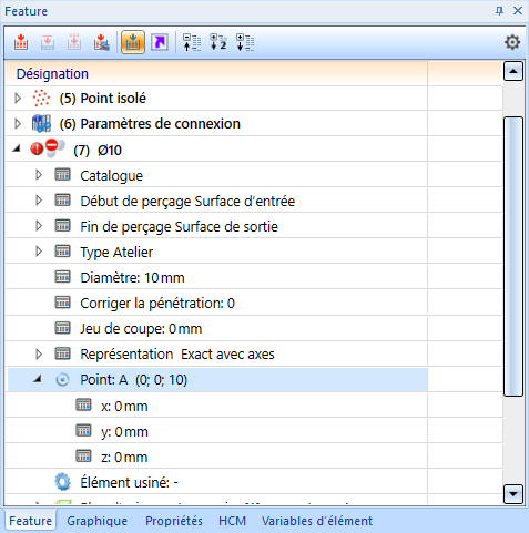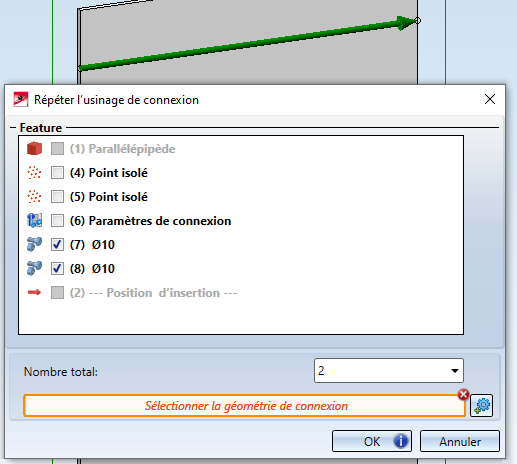 15 0 0. Dans l'étape 7, nous nous souvenons que les deux perçages ont des Plans d'usinage et des Contraintes différents. Nous pouvons ici l'ignorer, car en lançant bientôt la fonction Répéter l'usinage de connexion les valeurs en seront à nouveau définies.