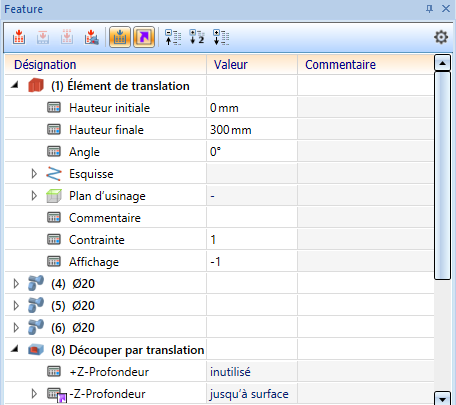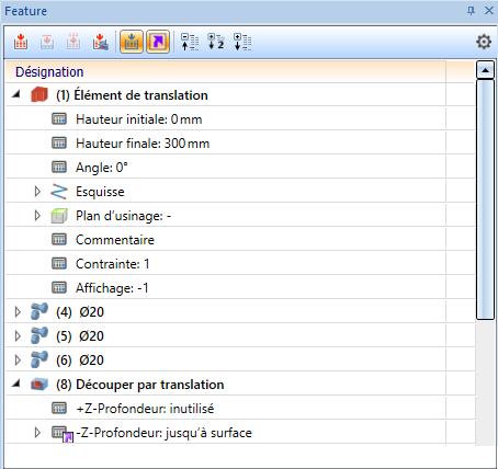 Détermine si les entrées de l’historique de Feature doivent être réparties dans plusieurs colonnes ou réunies dans une seule et même colonne. La deuxième option reprend l’affichage standard de l’historique de Feature des versions de HiCAD antérieures à la version 2020 SP2.