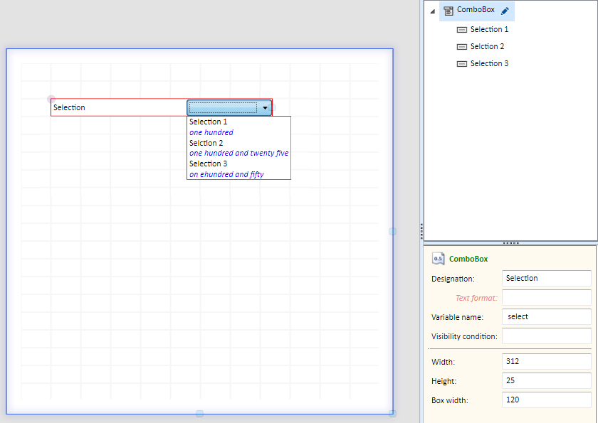 In contrast to the object EditBox, the entries of the selection box comprise two rows. The text of the second row is defined in the Description column.